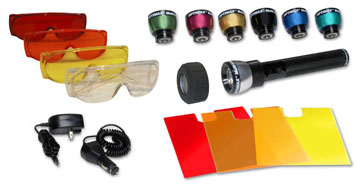 多波段警用檢查光源配有結(jié)實(shí)的黑色陽(yáng)化鋁手電殼體、七個(gè)可快速更換的LED燈頭(UV-A(長(zhǎng)波紫外)、藍(lán)光、藍(lán)綠光、綠光、琥珀光及白光)、三個(gè)插入式濾色板(黃色、橙色及紅色)、交流及直流充電器、四個(gè)眼鏡(紫外防護(hù)、橙色、黃色及紅色眼鏡)及一個(gè)手提箱。