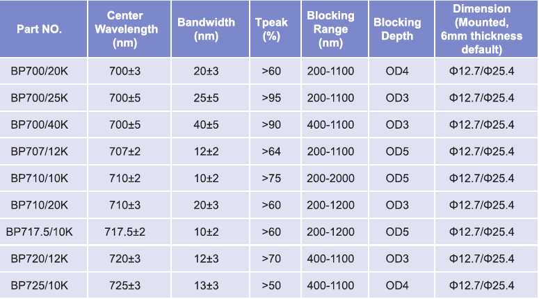 帶通濾光片波長(zhǎng)范圍:700nm-725nm