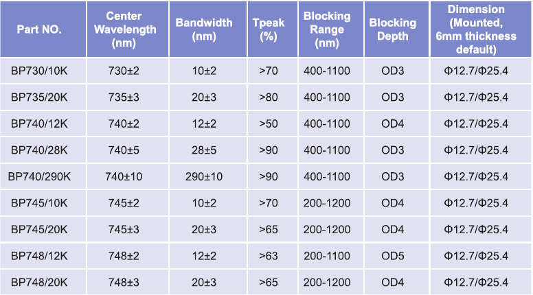 帶通濾光片波長(zhǎng)范圍:730nm-748nm