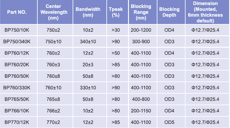 帶通濾光片波長(zhǎng)范圍:750nm-770nm