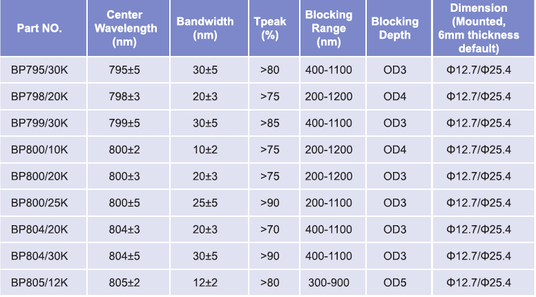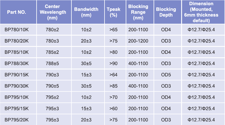帶通濾光片波長(zhǎng)范圍:780nm-795nm