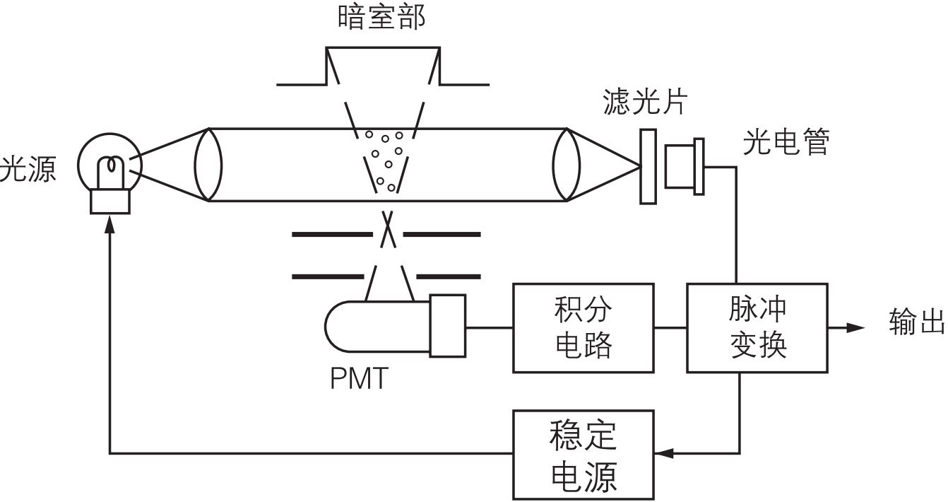 測試方法使用光散射及β線吸收等,F(xiàn)ig.1 是原理圖。如果光通過的地方有浮游粒子,光照到浮游粒子上就會產(chǎn)生散射,浮游粒子越多,散射光越強且和浮游粒子的量成比例。在這種儀器中,用光電倍增管來接收該散射光,將此信號積分后變換成脈沖信號,使其輸出和濃度相對應(yīng)。因為這種方法對濃度的變化能立刻跟蹤,因此適用于要監(jiān)視連續(xù)且長時間變化的場合。