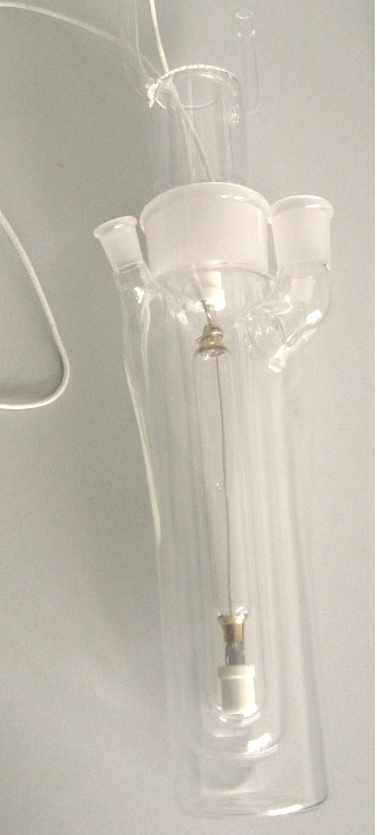型號(hào):PH225,石英玻璃材質(zhì),用于長弧汞燈的冷卻,可以通除部分紅外光降低熱效應(yīng),磨口60/40,有效長度225mm